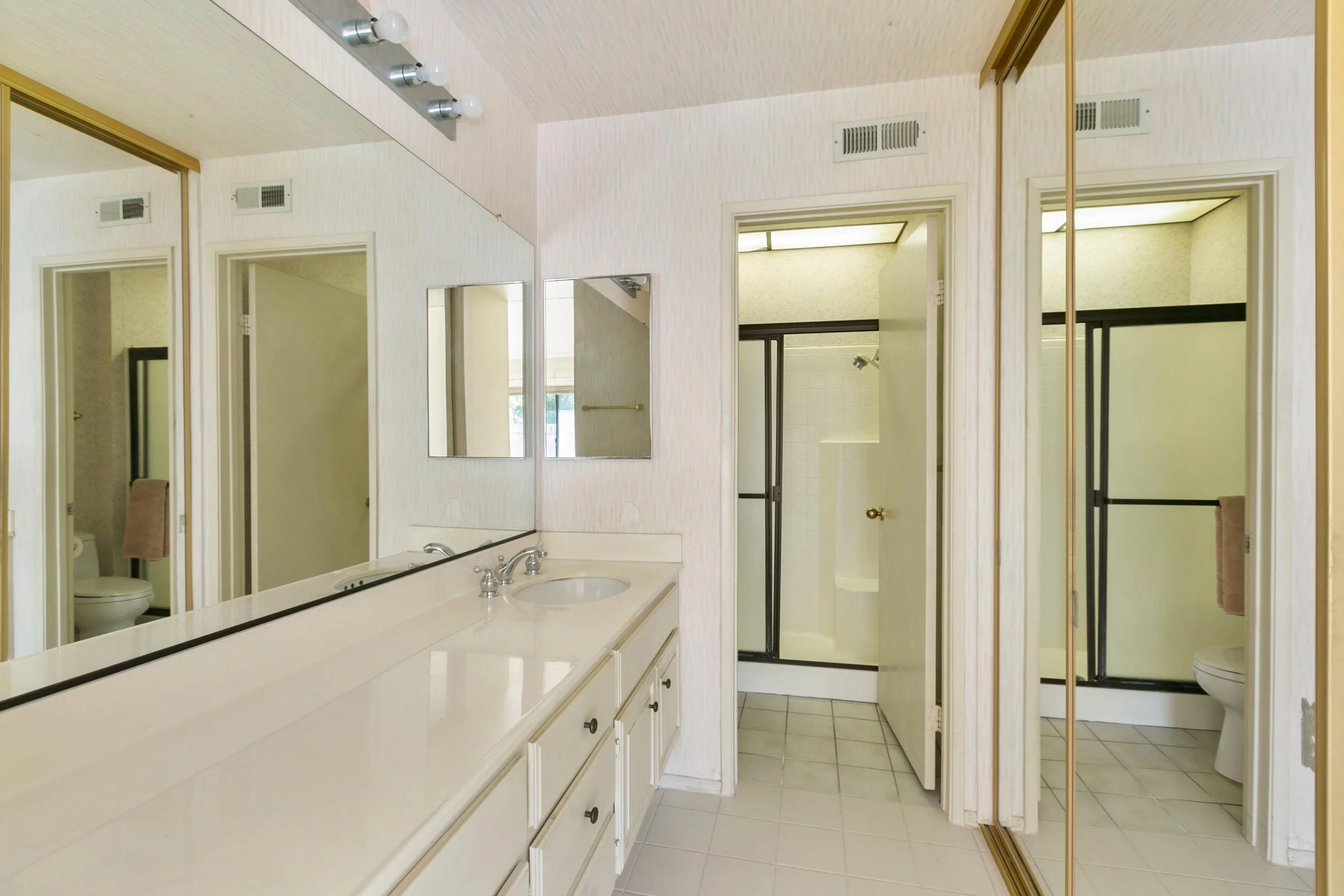 The master bathroom felt small and dark, there was wallpaper on the walls and ceilings of the bathroom. The shower was one giant plastic insert and there was fluorescent lighting above the shower. The flooring was old tile and carpet. There was only one light fixture, above the sink and only one sink (but there was already plumbing for 2 sinks inside the cabinet). There was no door between the bedroom and bathroom and there were lots of random cabinets inside the closet area. Also, since the closet and bathroom had large mirrors, it felt like you were walking into a hall of mirrors with reflections everywhere.